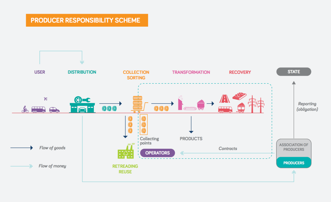 Producer responsibility means that the tire manufacturer is fully or partially liable for a product which reaches a post-consumer stage of its life cycle. Namely, under this system, the tire manufacturer is liable of ensuring that the tires which reach end-of-life stage are disposed of responsibly and in an environment-friendly way.